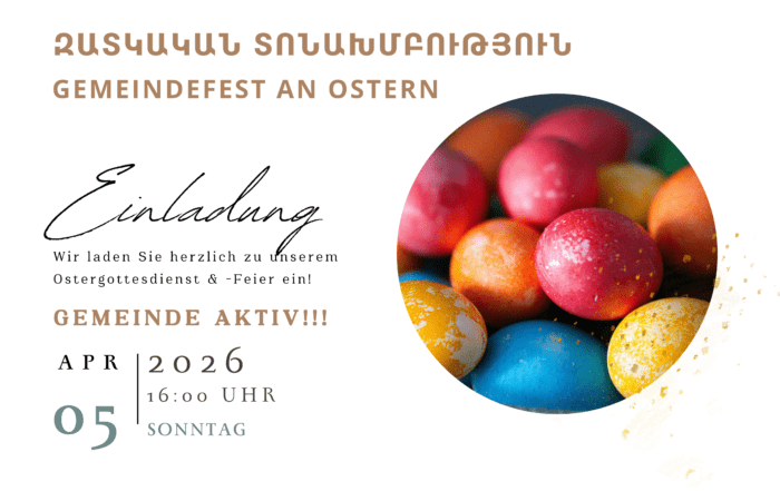 Զատկական Տոնախմբություն Gemeindefest an Ostern Liebe Gemeinde, Քրիստոս յարեաւ ի մեռելոց: Օրհնեալ է Յարութիւնն Քրիստոսի: Nach dem festlichen Ostergottesdienst laden wir herzlich zu unserem Gemeindefest ein. bunter, lebendiger und begegnungsreicher [...]